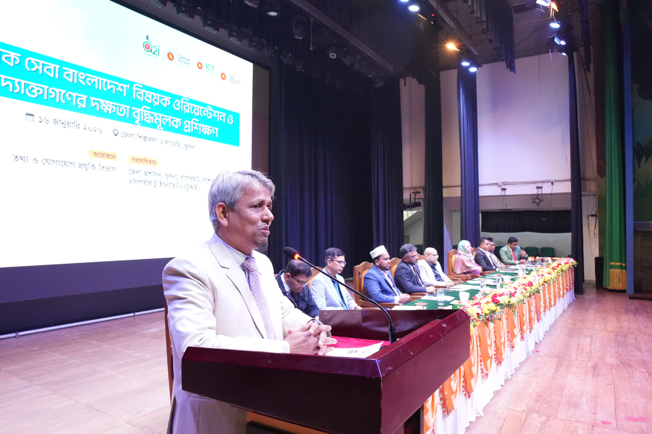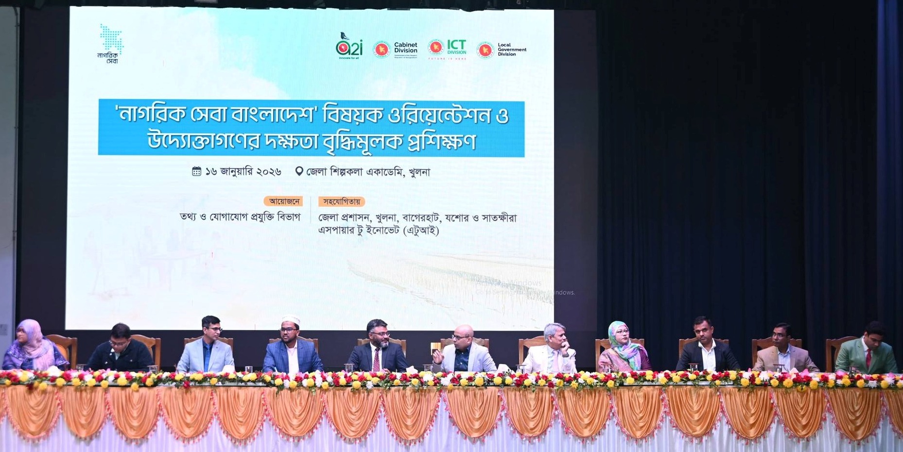 শুক্রবার সকালে খুলনা জেলা শিল্পকলা একাডেমি অডিটোরিয়ামে ‘নাগরিক সেবা বাংলাদেশ’ বিষয়ক ওরিয়েন্টেশন ও উদ্যোক্তাদের দক্ষতা বৃদ্ধিমূলক প্রশিক্ষণ অনুষ্ঠিত হয়েছে। তথ্য ও যোগাযোগ প্রযুক্তি বিভাগের আয়োজনে এবং খুলনা জেলা প্রশাসন ও এসপায়ার টু ইনোভেট (এটুআই)-এর সহযোগিতায় কর্মশালাটি অনুষ্ঠিত হয়।কর্মশালার মূল অধিবেশনে ‘নাগরিক সেবা বাংলাদেশ’ উদ্যোগের লক্ষ্য ও উদ্দেশ্য, কার্যপরিধি, বিদ্যমান সেবাসমূহ, সার্বিক অগ্রগতি, নাগরিক সেবা কেন্দ্রের কাঠামো, উদ্যোক্তাদের ভূমিকা এবং ভবিষ্যৎ বাস্তবায়ন পরিকল্পনা তুলে ধরা হয়।
