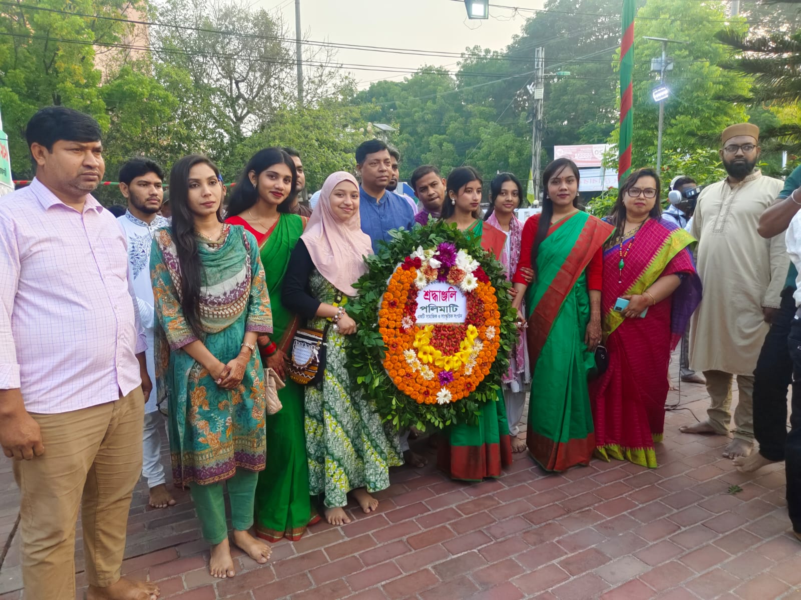 মুক্তিযুদ্ধের স্মৃতিস্তম্ভে পুষ্পস্তবক অর্পণের সময় রাজশাহীর অতিরিক্ত বিভাগীয় কমিশনার (সার্বিক) মোহাম্মদ হাবিবুর রহমান,পরিবেশ অধিদপ্তর, রাজশাহী’র উপ পরিচালক মোছাঃ তাছমিনা খাতুন, জেলা পরিষদ, রাজশাহী’র উপ প্রকৌশলী আলিফ মাহমুদ, লেখিকা আমিনা আনসারী , পলিমাটি’র সভাপতি উজ্জ্বল আলী এইচটিআই এর সভাপতি নাহিদ হোসেন , পলিমাটির সদস্য ছোঁয়া, মাধুর্য, খুশি, সুরভী, শারমিন, সাইফ, মাহিমসহ অন্যান্যরা উপস্থিত ছিলেন।